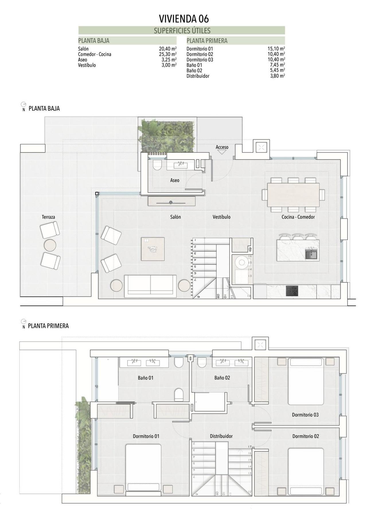 Each villa is built on a private plot of approximately 300 m2 and offers around 140 m2 of modern living space distributed over two floors. The properties feature three double bedrooms, two full bathrooms with double sinks including an en suite, and an additional guest toilet.
